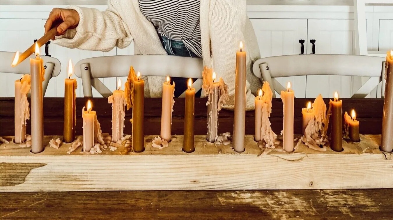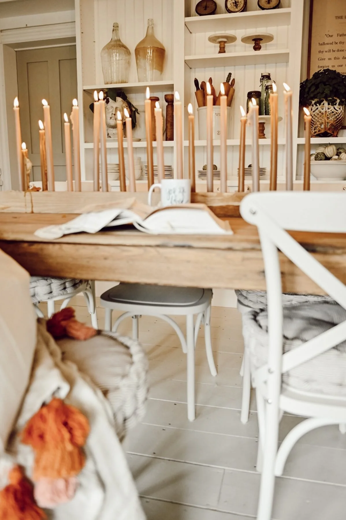 This DIY Candlestick Holder centerpiece makes a huge statement when added to your dining room table but is actually super easy to make! The best part is that you can customize the size of the centerpiece to fit your dining room table. Once the candles start to melt they create this trickled wax look and add even more fun & texture to this already gorgeous centerpiece! By choosing warm neutral colors for your candles, this centerpiece can transition effortlessly from autumn into the holiday season. You can even swap the candles to a classic white to extend into the dreary winter months!